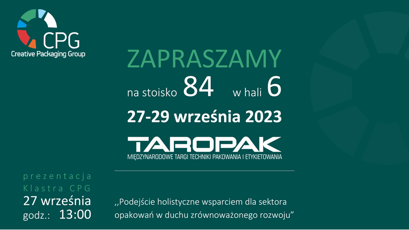 Klaster Creative Packaging Grup będzie obecny na Targach Taropak w dniach 27-29 września na stoisku nr 84 w pawilonie 6. Pierwszego dnia targów na scenie główniej umiejscowionej w pawilonie 6 przedstawiciele Klastra CPG przedstawią prezentację pt. Klaster CPG - Creative Packaging Group - podejście holistyczne wsparciem dla sektora opakowań w duchu zrównoważonego rozwoju. Prelegentami będą:
