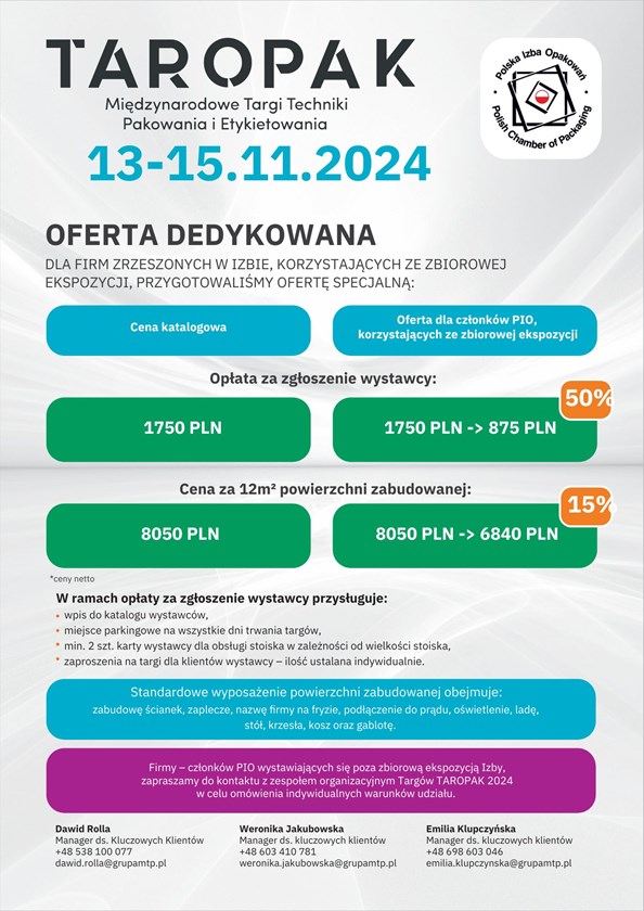 Ze względu na dotychczasową wieloletnią, owocną współpracę w ramach Polskiej Izby Opakowań oraz chęć jej kontynuacji w kolejnych latach, przygotowaliśmy dla Państwa wyjątkową ofertę specjalną obowiązującą na Targi TAROPAK 2024.